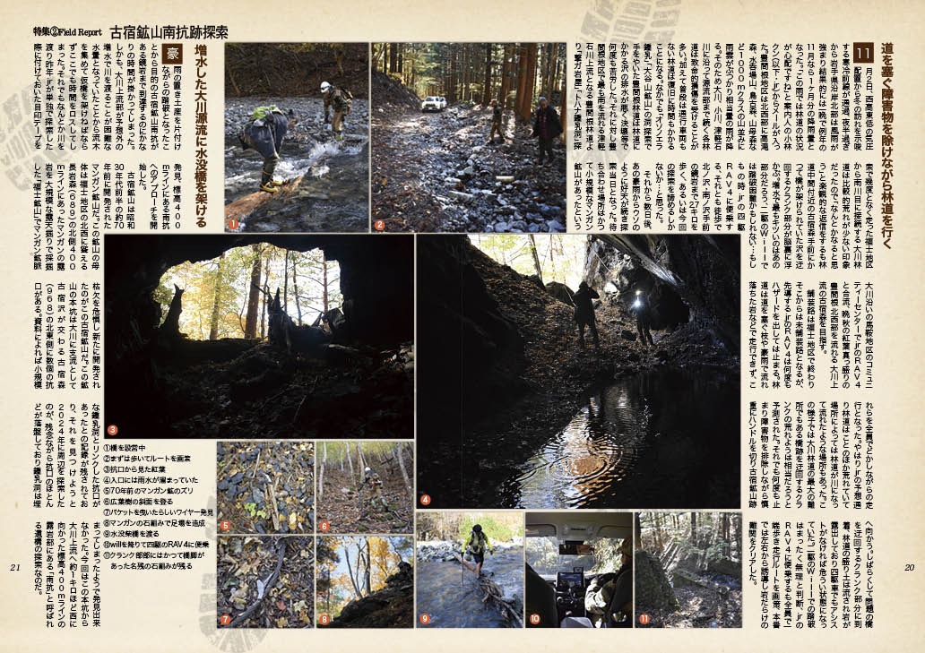 岩手の中央部を形成する北上山地の地質は約1億5千万年の古生代から中生代に形成され、海底が隆起した帯状の石灰岩を含む地層は沿岸北部に多い。それらが白亜紀の活発な火山活動で溶岩による熱変成を受けて変成鉱物のマンガンに置き換わりバラ輝石などの層状マンガン鉱床を形成した。近世になりこれら変成鉱物は露岩として目に触れたり山師たちの目利きによって拓かれた。蓄電池の原材料として山師たちがマンガン鉱でひと財産を目論んだ昭和30年代、下閉伊上閉伊から野田通りには小規模なマンガン鉱山が林立、多くの人が夢と欲望に揺り動かされ山と対峙していた。今回探索した古宿鉱山南抗跡も約70年前に掘られた夢と欲の坑道を残していた。