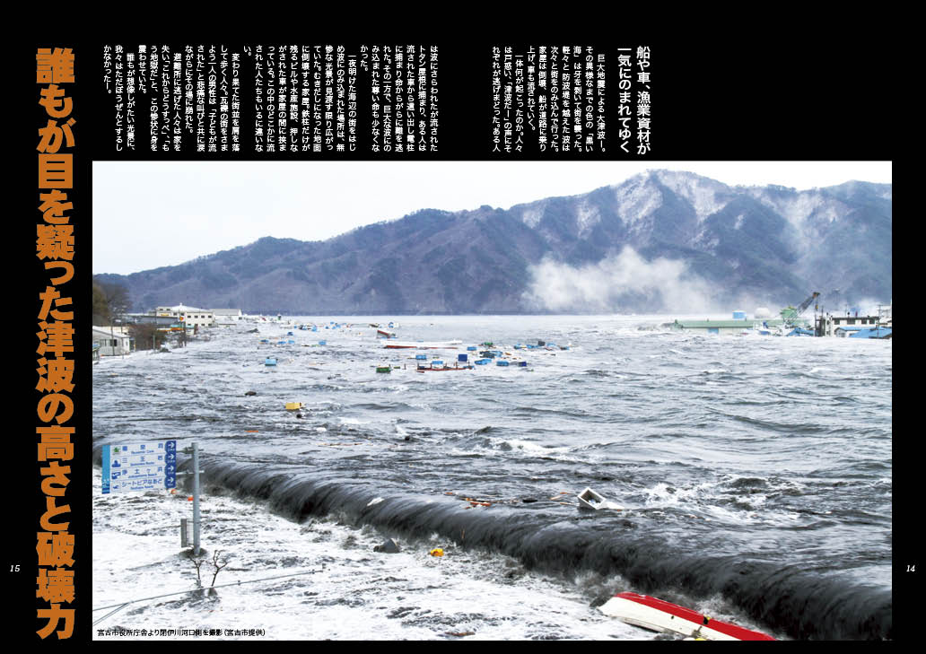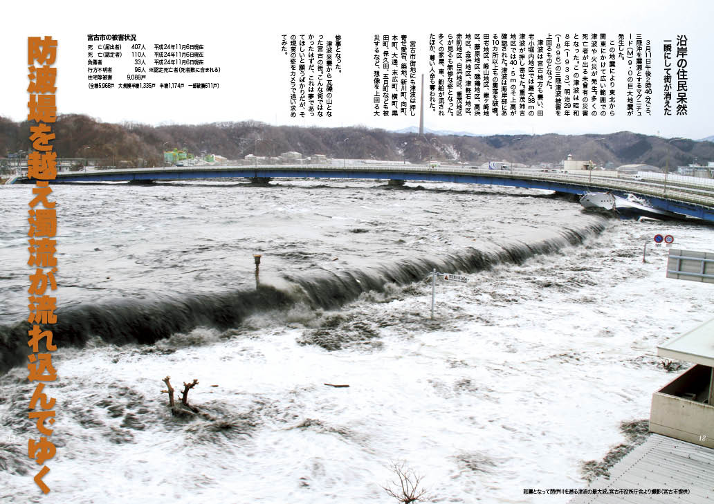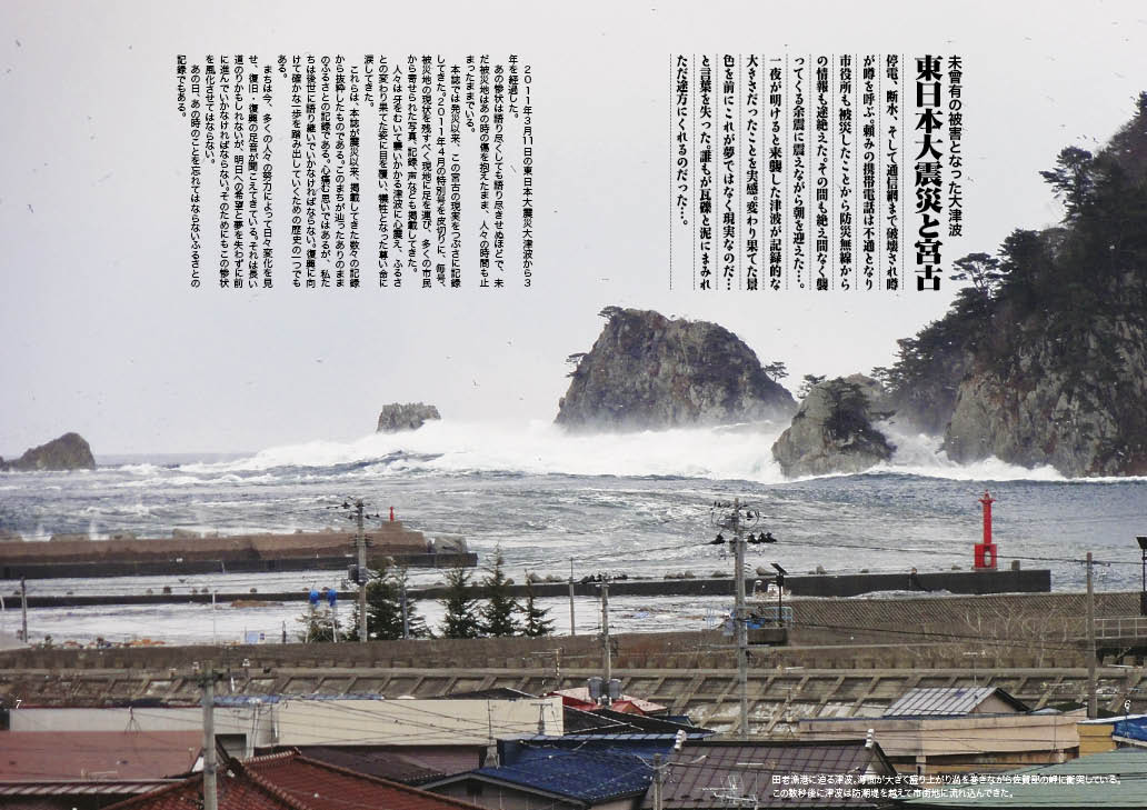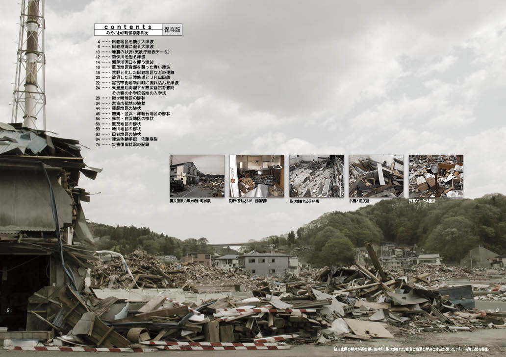 2011年に起こった東日本大震災における宮古市の惨状を記録した写真集。震災から数冊の特別号を発行したが、そのすべてが売り切れとなり、震災から三年目の2014年に、それまでに発行したみやこわが町や、震災後に寄せられた未発表の写真などを使って新たに編集した、永久保存版。コンテンツは次の通り…。