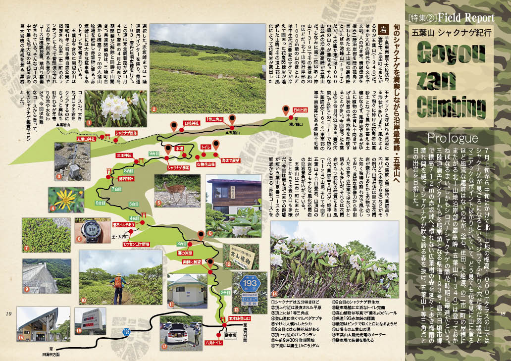 7月上旬から中旬にかけて北上山地の標高1000mクラスの山ではシャクナゲが見ごろになるという。オヤジふたりで穴だ滝だ廃墟だとマニアックなポイントばかり歩いていて、どう見ても花を見に山に登るほど風流な趣味はないのだが、釜石、住田、大船渡、の二市一町の屋根にまたがる北上山地沿岸部の最高峰・五葉山(1340)は登っておかねばなるまい。しかもシロバナシャクナゲの開花時期に最適だという。三陸道唐丹インターから冬期閉鎖となる県道193号・唐丹日頃市線で標高712mの赤坂峠へ。慣れない広葉樹の森を延々と歩き梅雨の晴れ間を縫ってシャクナゲが咲き誇る森を抜け、五葉山1等三角点と日の出岩を目指した。