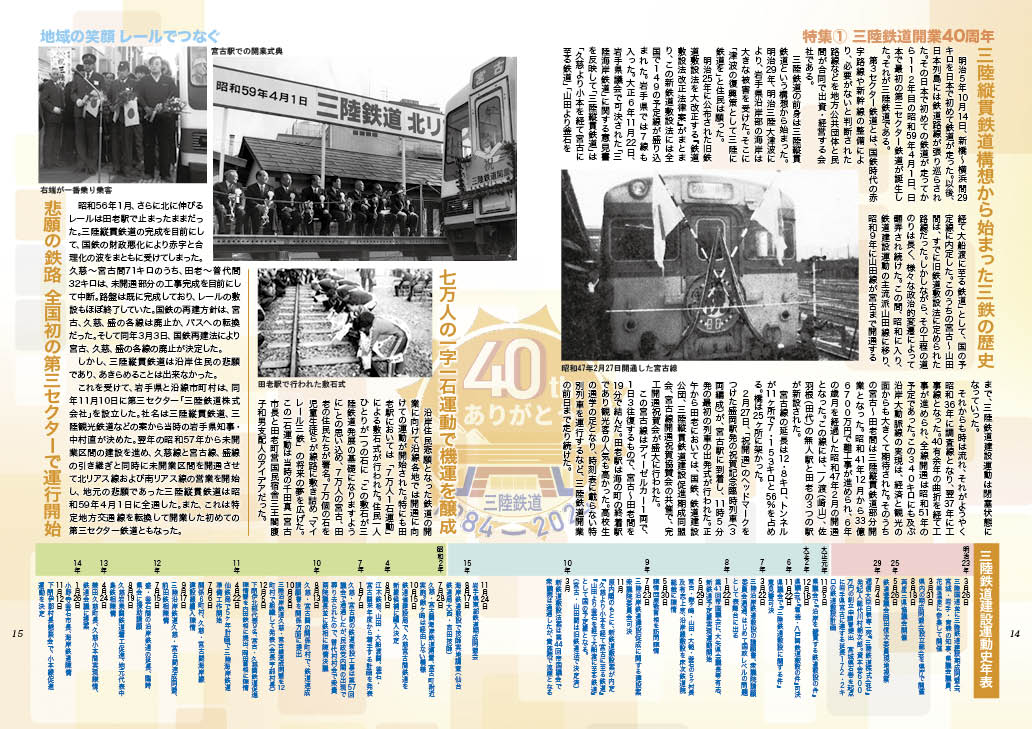 三陸鉄道は1984年4月1日の開業以来、北リアス線(宮古~久慈71キロ)と南リアス線(盛~釜石36キロ)を運行してきた。沿線住民悲願の足として親しまれながら第三セクター鉄道として40年の歴史を刻んできた。この間、2019年3月23日からは東日本大震災で被災したJR山田線(宮古ー釜石間)が三陸鉄道に移管され、これにより久慈ー盛間が一本で繋がり、全体で163キロという第三セクター鉄道での国内最長路線として運行されている。三陸鉄道は明治、大正、昭和の時代から住民悲願の鉄道であった。誘致から80年余に及ぶ長い歳月は、先人の血と汗の滲む苦労の歴史でもあった。開業40周年を機にその開通までの歴史とともに、その歩みを振り返ってみる。