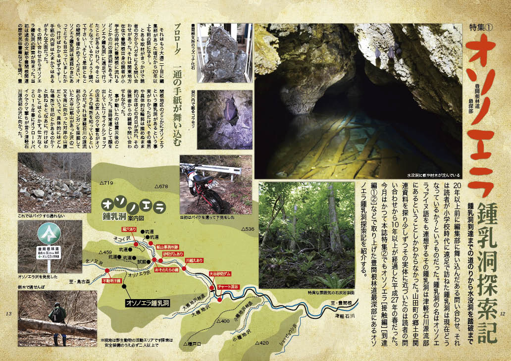 20年以上前に編集部に舞い込んだある問い合わせ、それは読者が小学校時代に遠足で訪ねた鍾乳洞は現在どうなっているか?というものだった。鍾乳洞の名はオソノエラ。アイヌ語をも連想するその鍾乳洞は津軽石川源流部にあるということしかわからなかった。山田町の郷土史関連資料を探り少しずつその実体に近づいたのは読者の問い合わせから10年以上が経過した平成27年の春だった。今月はかつて本誌特集②でもオソノエラ[接触編][到達編①②]などで取り上げた豊間根林道最深部にあるオソノエラ鍾乳洞探索記を紹介する。