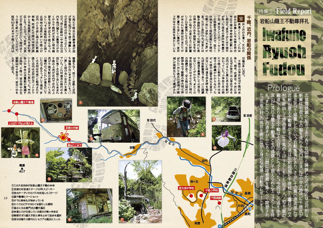北部環状線の起点であり西ヶ丘団地と隣接した近内地区は近代的な近代的な新興住宅街だ。その脇を流れる近内川上流には中世の千徳氏が落ち伸びて帰農したという岩船集落があり、さらにその奥の源流部には岩船山龍王不動滝がある。この道は昭和初期に千徳村から蟇目の二又村を経由して源兵衛平に牛馬の上げ下ろしをした知る人ゾ知る「奥の細道」であり龍王不動はその目印のひとつであった。今回はこの道を歩き深山に流れる龍王不動滝とその偶像として据えられたモニュメントを拝礼。またかつてこの道すがらにあった山間に理想郷を築くべく開墾された「芸術の村」の現状を眺めながら身近な秘境岩船をレポートする。