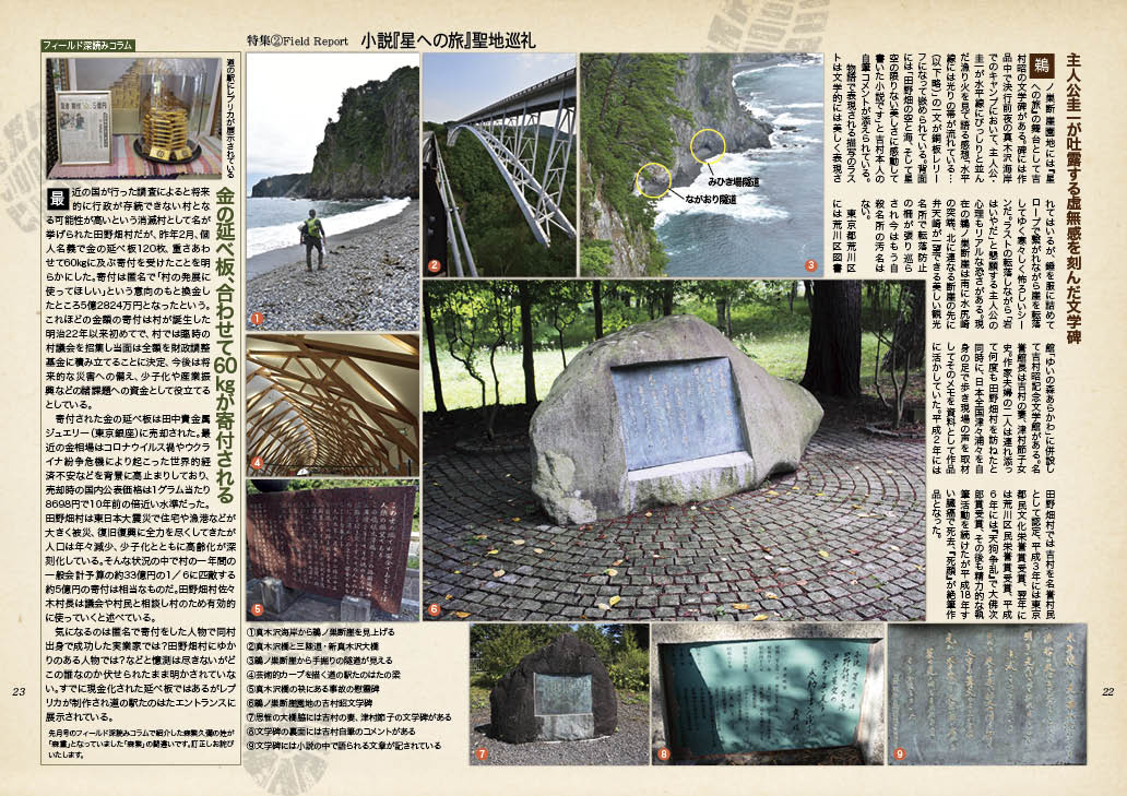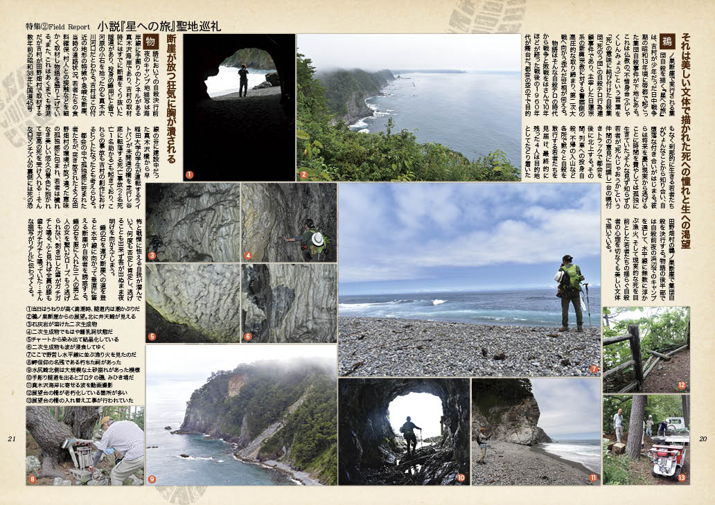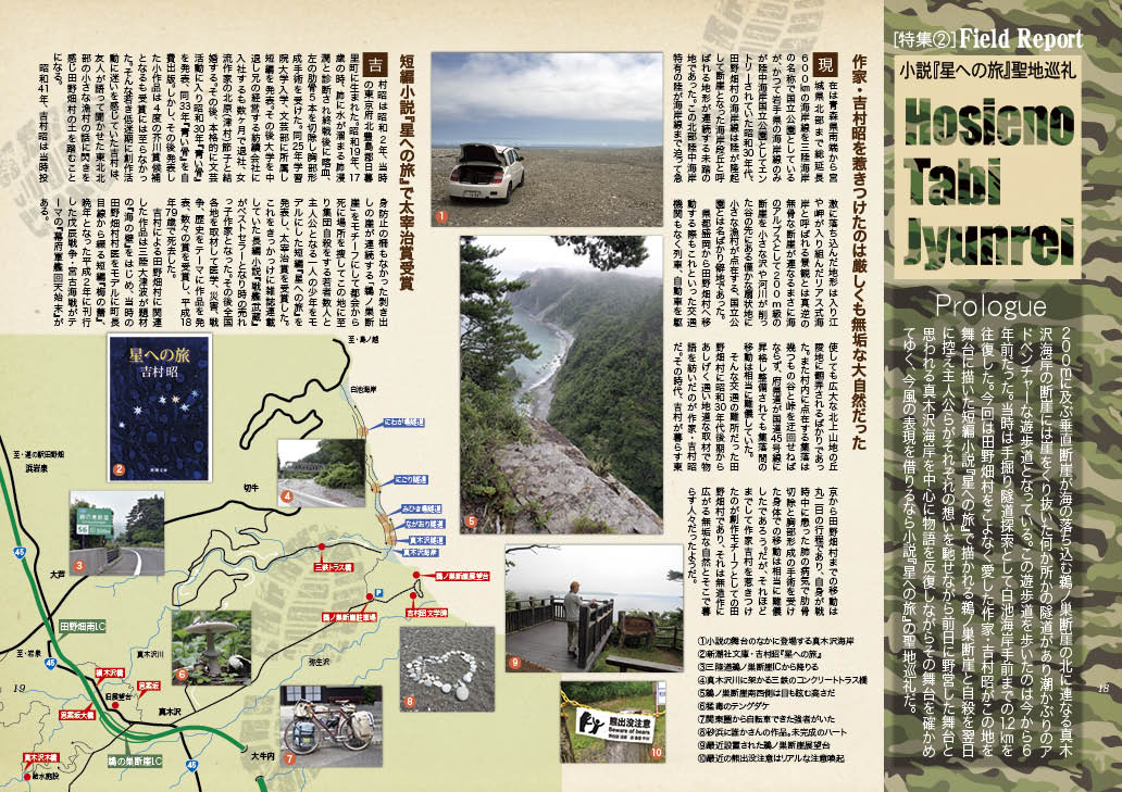 200mに及ぶ垂直断崖が海の落ち込む鵜ノ巣断崖の北に連なる真木沢海岸の断崖には崖をくり抜いた何か所かの隧道あり潮かぶりのアドベンチャーな遊歩道となっている。この遊歩道を散策は今から6年前の2017年7月だった。当時は手掘り隧道探索として白池海岸の手前まで歩いたのだが、今回は田野畑村をこよなく愛した作家・吉村昭がこの地を舞台に描いた短編小説『星への旅』で描かれる鵜ノ巣断崖と自殺を翌日に控え主人公らがそれぞれの想いを馳せながら前日に野営した舞台と思われる真木沢海岸を中心に物語を反復しながらその舞台を確かめてゆく、今風の表現を借りるなら小説『星への旅』の聖地巡礼だ。