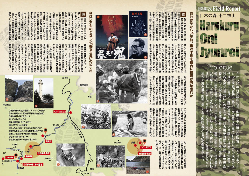 今から34年前の昭和63年、俳優・小林旭が初監督としてメガホンをとった映画『春来る鬼』のロケが重茂半島で行われた。この映画の原作は盛岡市出身で三陸大津波を宮古で体験した作家・須知徳平の同名小説だ。須知はこの作品で第一回吉川英治賞を受賞、小林旭監督はこの小説を原作として独自の感性で映像を紡ぐことに約7億円の巨額を注ぎ込んだ。ロケ地となった重茂の海岸や山林で撮影が開始され完成した作品はカンヌ映画祭にも出品したが、挙行は振るわず忘れ去られた。今月はそんな往年の映画ロケを懐古しながら原作を読み解き関連ヵ所を巡る映画『春来る鬼』の聖地巡礼だ。