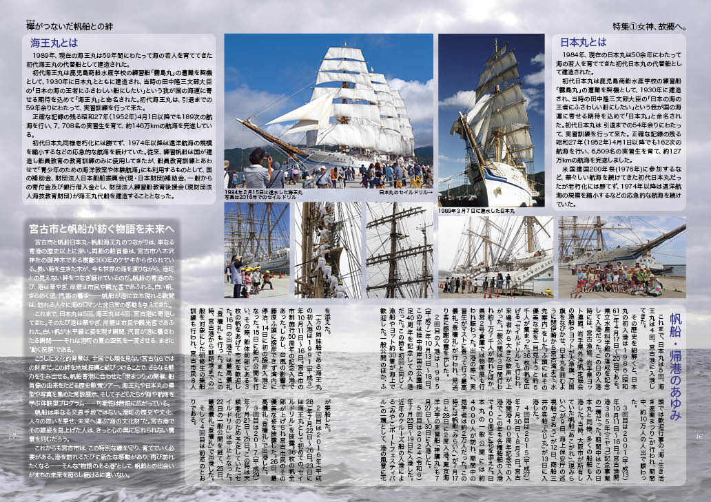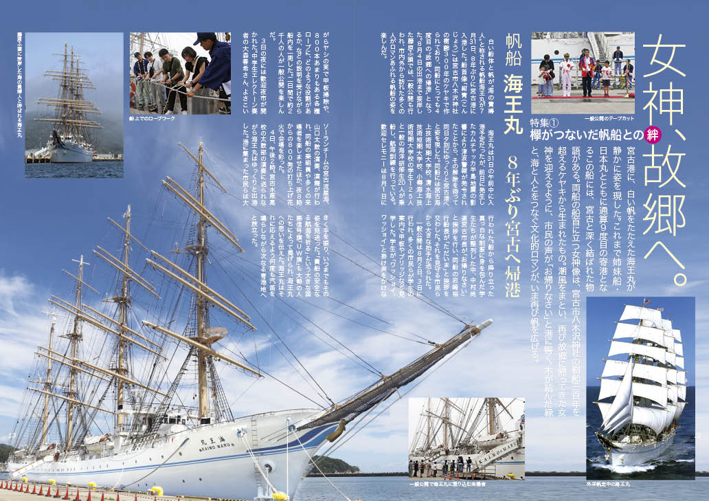 宮古港に、白い帆をたたえた海王丸が静かに姿を現した。これまで姉妹船・日本丸とともに通算9度目の寄港となるこの船には、宮古と深く結ばれた物語がある。両船の船首に立つ女神像は、宮古市八木沢神社の樹齢三百年を超えるケヤキから生まれたもの。潮風をまとい、再び故郷に帰ってきた女神を迎えるように、市民の声が「お帰りなさい」と港に響く。木が結んだ縁と、海と人とをつなぐ文化的ロマンが、いま再び帆を広げる。